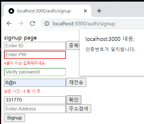 이제 확인버튼을 누르면 입력한 인증번호를 bcrypt한 값이랑 쿠키에 담겨있던 암호화된 인증번호를 비교해서