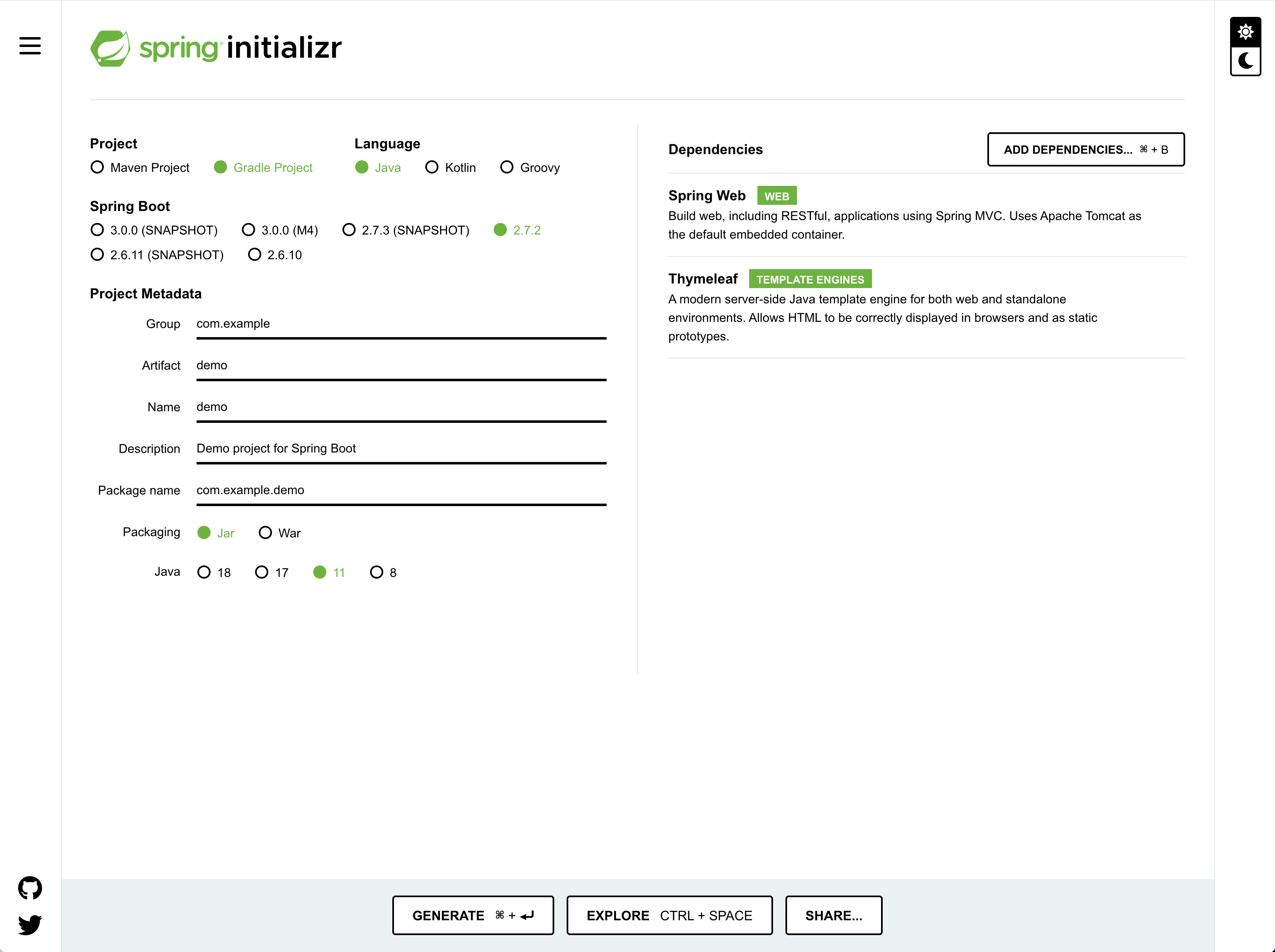 ddl-auto : JPA는 테이블을 자동으로 생성하는 기능을 제공하는데 none 를 사용하면 해당 기능을 끈다. create 를 사용하면 엔티티 정보를 바탕으로 테이블도 직접 생성해준다. 해보자.