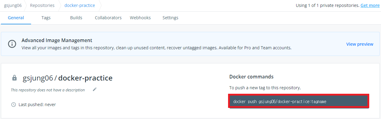 Dockerhub 사이트에 들어가면 자동으로 생성된 Repository를 볼 수 있다. (새로 만든 것도 가능)