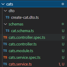 기본적인 cats 모듈,컨트롤러,서비스를 만들고 schemas 폴더를 다음과 같이 옮긴다.