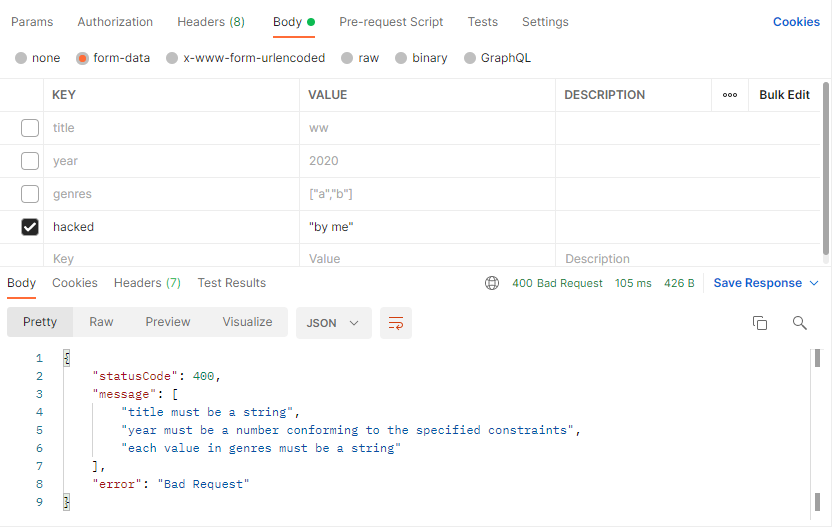 그 다음 postman에서 다음과 같이 POST 메소드로 {hacked: "by me"} 라는 body를 요청해보면 이런 결과창이 뜬다.