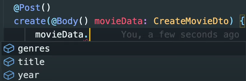 ValidationPipe 와 CreateMovieDto를 사용하고 있기 때문에 DTO의 타입을 실시간으로 확인할 수 있는 것이다.