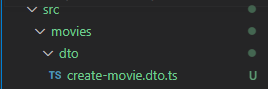 updateData랑 movieData한테 타입을 부여하기 위해서 우리는 DTO(Data Transfer Object, 데이터 전송 객체)를 만들어야한다. 먼저 create-movie.dto.ts 파일을 만들자.