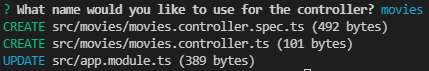 자동으로 movies라는 폴더가 생성되고, 루트 모듈 파일에 자동으로 Moviescontroller가 생성되는걸 확인할 수 있다
