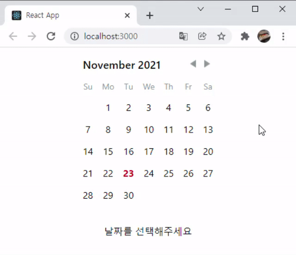 그럼 이번에는 onDayClick()을 통해 날짜를 선택할 때 하단에 해당 날짜가 출력되게끔 수정해보자.