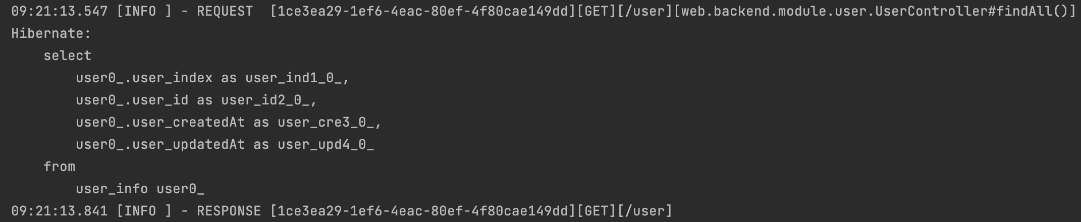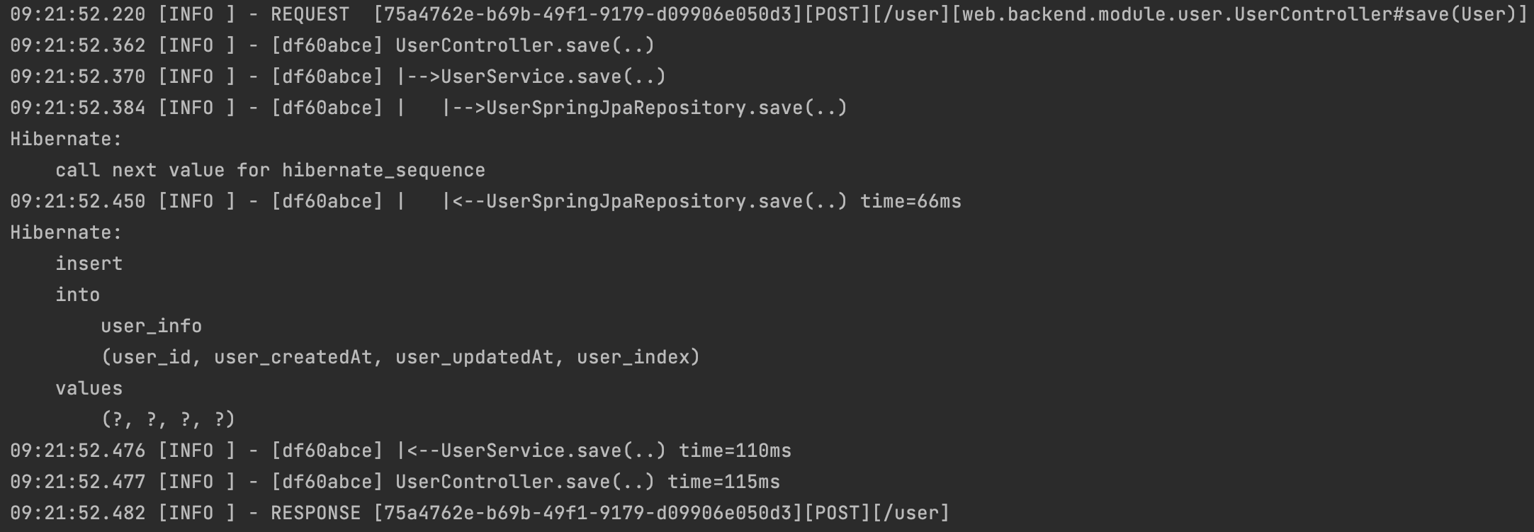 save 로직에 @LogTrace 어노테이션을 주고 findAll() 메소드와 비교해보겠다.