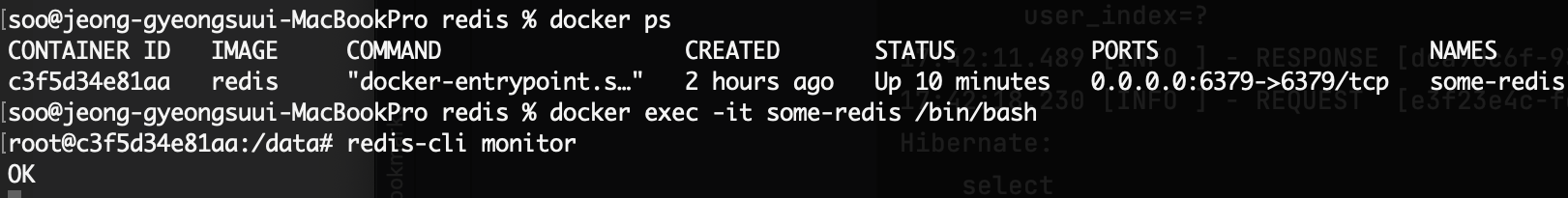 Spring Server를 키고 Redis Container에 접속한 후 요청을 보내서 로그를 확인해보자.