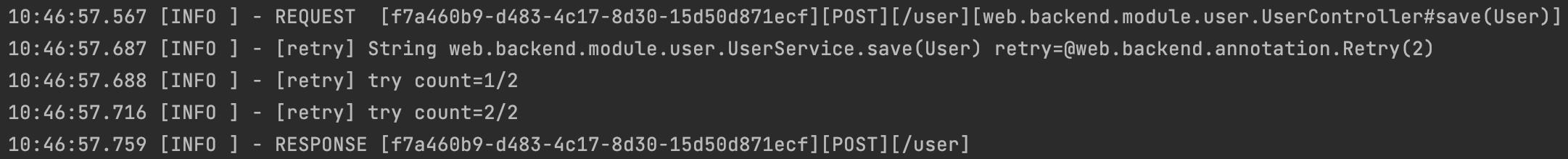 log.info("[retry] {} retry={} ", joinPoint.getSignature(), retry);